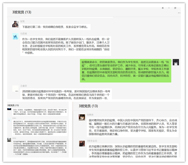 紧接着,王睿贤、裴子晨、王瀚晨、汤菀晨、王紫荆等10位同志也纷纷发表了自己的学习感想。身处武汉的王紫荆同志,首先表达了她对全社会无私帮助的感恩,对同学老师亲切关怀的感谢。作为武汉市民的她,在这些日子里,服从学校安排,不聚餐、不窜门、勤洗手、勤消毒、戴口罩,在家中进行线上课程学习和远程工作。支部成员纷纷对她在灾难时刻发挥党员带头作用的行为表示了赞许和鼓励。