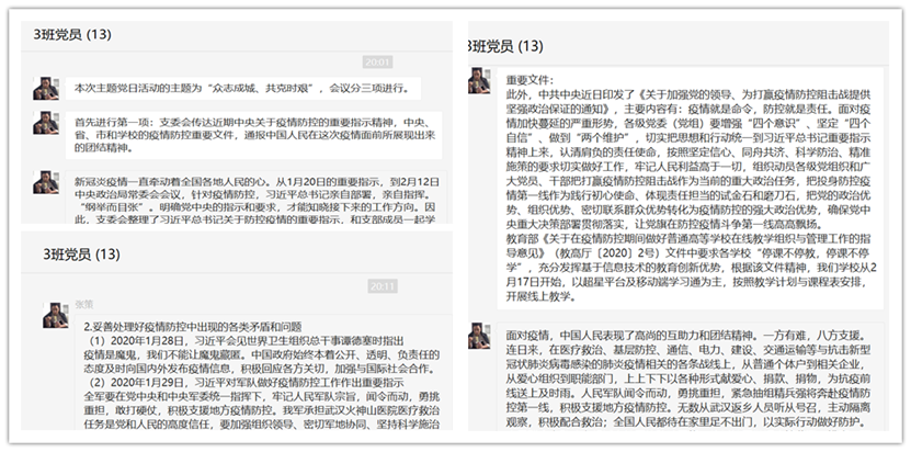 此次会议主要有3个议程,一是支委会传达近期中央关于疫情防控的重要指示精神,中央、省、市和学校的疫情防控重要文件,通报中国人民在这次疫情面前所展现出来的团结精神;二是党员明确自身职责,发表会议学习感言;三是支部党员重温入党誓词。此次线上会议由党支部书记张策同志主持。