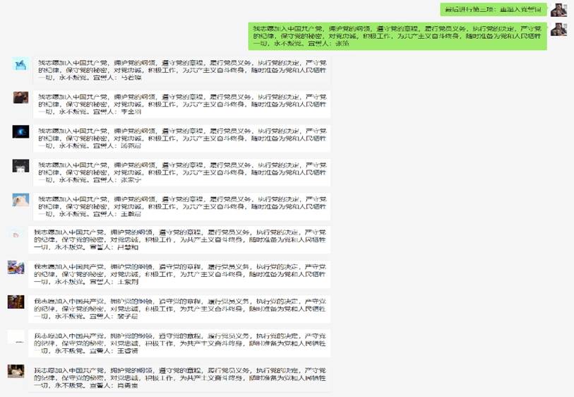 会议的最后一项内容是支部党员线上文字重温入党誓词。由支部书记张策同志领誓,全体党员重温入党誓词。