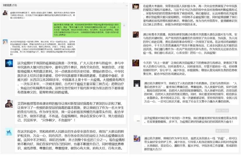 2020年3月9日下午14:30-16:30,350vip浦京集团官网2019级研究生第四党支部举办了以“疫情防控”为主题的主题党日活动,所有成员共同观看了“全国大学生同上一堂疫情防控思政大课”直播,并在直播结束后于微信群开展了学习和交流活动。本次“思政大课”特别邀请艾四林、秦宣、王炳林、冯秀军4位教授,结合“马克思主义基本原理概论”“毛泽东思想和中国特色社会主义理论体系概论”“中国近现代史纲要”“思想道德修养与法律基础”4门必修课教学内容,解读党中央关于疫情防控的决策部署,分析中国抗疫彰显的中国共产党领导和中国特色社会主义制度的显著优势,讲述防疫抗疫一线的感人故事。