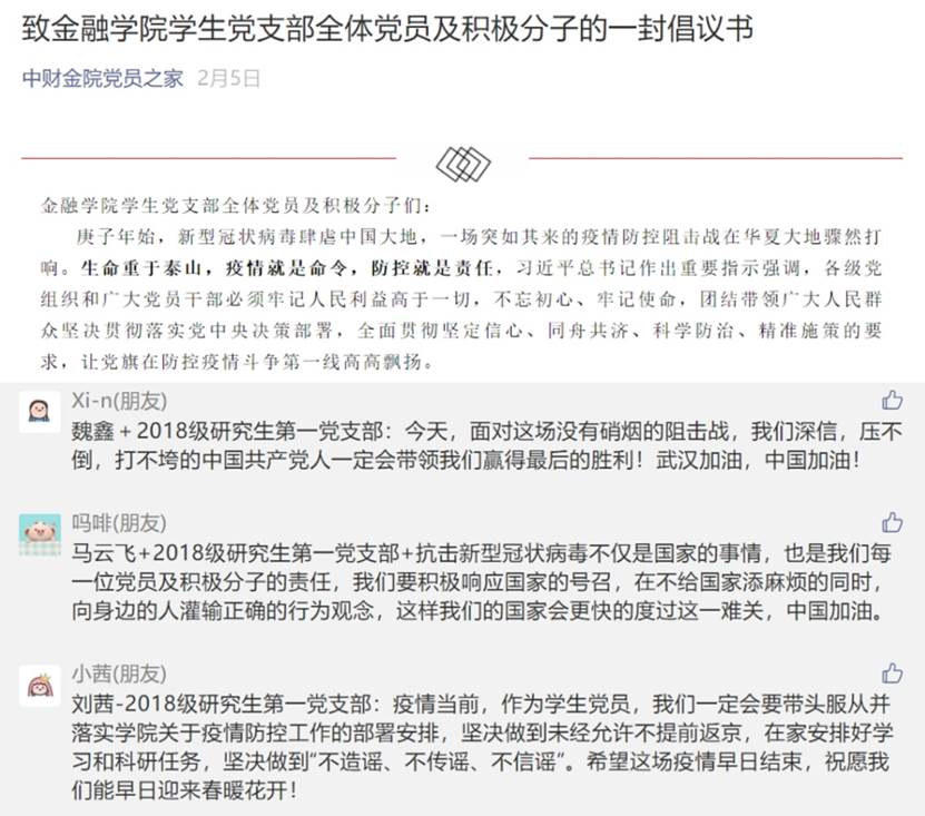 1月28日,学校党委发出了《致全校共产党员的一封信》,号召全校党员弘扬“担当责任、勇往直前”的中财精神,充分发挥共产党员的先锋模范作用,坚决打赢这场疫情防控阻击战。作为2018级研究生第一党支部书记的阮志朋同志第一时间转发,呼吁本支部党员同志提高政治站位,遵从党委统一部署,充分发挥研究生基层党组织战斗堡垒作用;强化政治担当,协助学校积极引导,充分发挥党员干部示范带头作用;增强政治自觉,严控自身行为作风,带头做命令的执行者、稳定的维护者。2月5日,学院党委发出了《致350vip浦京集团官网学生党支部全体党员及积极分子的一封倡议书》,号召全体党员及积极分子带头服从并落实学院关于疫情防控工作的部署安排,坚决做到在特殊时期不离家、不提前返校。本支部的党员同志和积极分子纷纷在微信公众号下留言承诺:“我将以身作则,少出门,少聚会,勤洗手,不传谣信谣,以实际行动发扬党员的模范带头作用”、“我们一定会带头服从并落实学院关于疫情防控工作的部署安排,坚决做到未经允许不提前返京,在家安排好学习和科研任务”……一句句承诺饱含着党员同志众志成城、共克时艰的决心与信心。