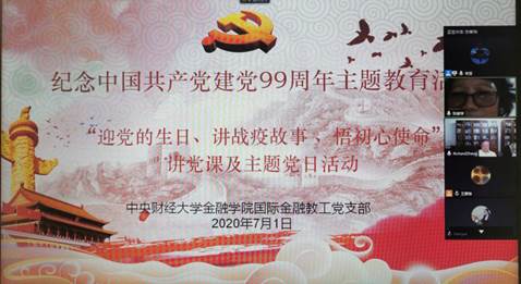 2020年7月1日,为隆重庆祝中国共产党建党99周年,回顾党的光辉历程、讴歌党的丰功伟绩,深入学习贯彻习近平新时代中国特色社会主义思想和党的十九大精神,不忘初心、牢记使命,以饱满的政治热情迎接建党100周年,根据教育部、教工委、学校和学院相关文件精神,在庆祝中国共产党建党99周年之际,在同心抗疫、共克时艰的重要时期,国际金融系教工党支部在线开展了庆祝中国共产党建党99周年主题教育系列活动之“迎党的生日、讲战疫故事、悟初心使命”主题党日活动。