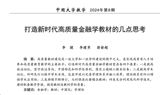 近日,浦京集团官网李健教授、李建军教授、彭俞超教授合作完成的教学论文“打造新时代高质量金融学教材的几点思考”在《中国大学教学》2024年第8期正式刊出。