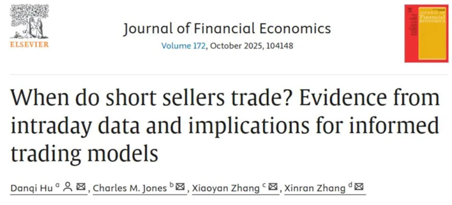 近日,浦京集团官网副教授张欣然,与哥伦比亚大学Charles M. Jones教授, 清华大学五道口350vip浦京集团官网张晓燕教授,北京大学光华管理学院胡丹琪副教授,合作撰写的论文“When Do Short Sellers Trade? Evidence from Intraday Data and Implications for Informed Trading Models”(“做空投资者在什么时候交易?来自日内数据的证据和对知情交易模型的启示”)在金融学国际顶级期刊Journal of Financial Economics第172卷正式发表。