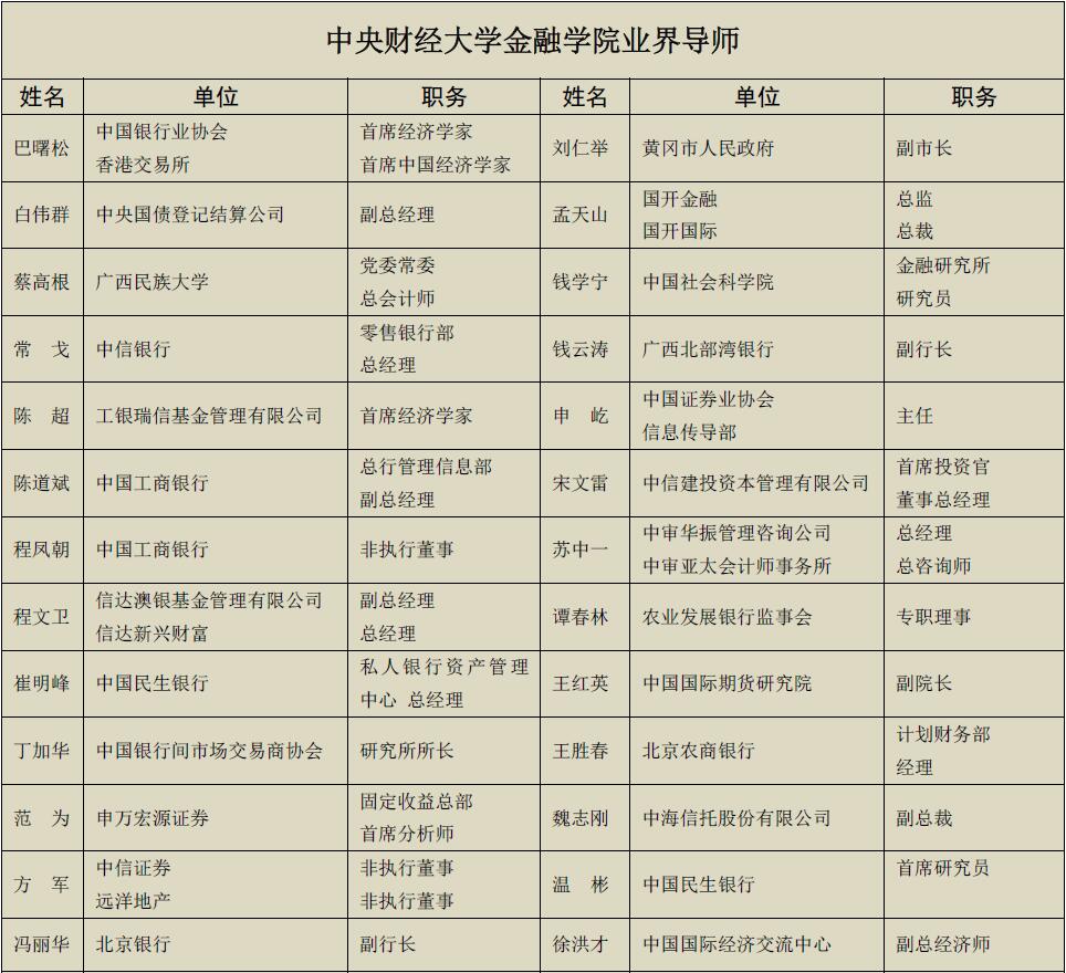350vip浦京集团官网聘请了一批有成就的政府部门领导、学术界和金融业界精英作为兼职教授和兼职导师。业界导师将给学生进行实务课程讲座,学员在学术论文写作时,校内和校外两位导师同时给予指导,凸显了我们培养学员过程中理论与实务相结合的特色。