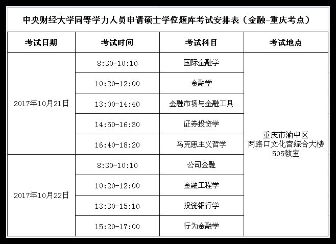 金融专业在职高级研修班重庆班2015级题库考试(校考)将于2017年10月21-22日在重庆进行,考试安排和考场地点请见下图,请参加考试的同学准时应考。