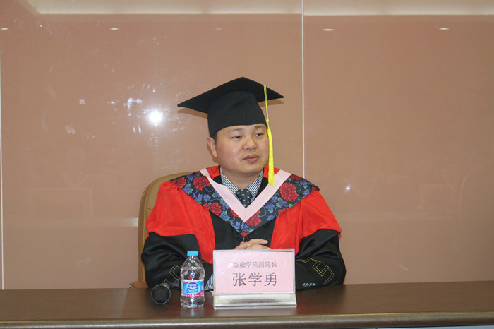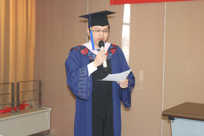 学生代表向海帆发言,作为2013级3班的班长,向海帆一直表现十分优越,不仅学习成绩全部以高分通过,硕士论文答辩顺利通过,还经常组织班级活动,加强了班级凝聚力。他仅用两年就拿到了硕士学位,堪称学生们的优秀榜样。他代表全体同学表达了对老师的感激,和对母校的不舍。几年来的学习和磨练,沉淀了大家的喜怒哀乐,他们将谨记中财“忠诚团结,求实创新”的校训,发扬龙马担乾坤的精神,带着中财校友的印记扬帆远航!