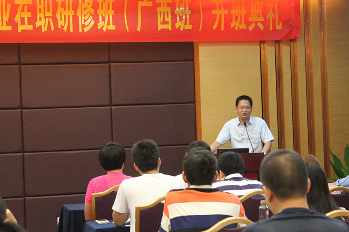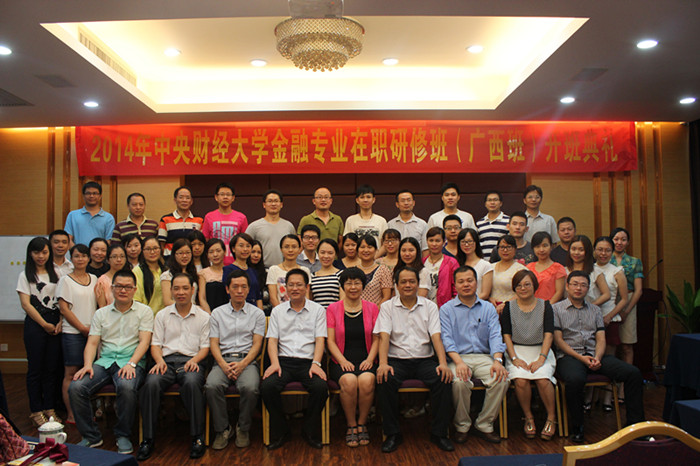 2014年9月13日上午,350vip浦京集团官网金融专业在职研修班(广西班)开班典礼在南宁市桂春路简约酒店三楼会议室隆重举行。出席本次开学典礼的领导和嘉宾有中财350vip浦京集团官网党总支书记葛仁霞、中财350vip浦京集团官网副院长张学勇、中财350vip浦京集团官网讲师魏旭、自治区财政厅教科文处处长蔡高根(业界导师)、广西北部湾银行副行长钱云涛(业界导师)、南宁市中小企业服务中心主任黄启年、广西揽胜企业管理服务有限公司董事长刘若兰、南宁市顶峰培训学校校长凌艺等。开学典礼由中财350vip浦京集团官网副院长张学勇主持。