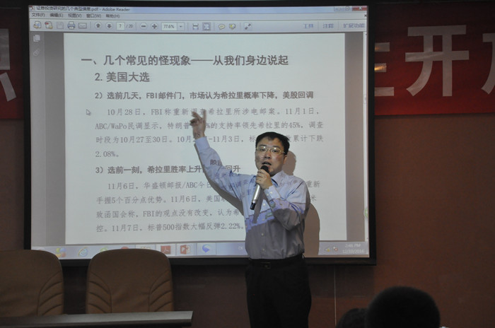 李少君博士从学生们耳熟能详的近期资本市场重要事件入手,深入浅出地讲解了证券投资分析的基本逻辑和方法。他首先以英国脱欧公投、美国大选等事件为切入点,激发大家思考资本市场定价反应背后的逻辑;随后引申到基础的定价模型,详细地解释了股价偏差产生的原因并从技术分析、基本面分析以及量化分析三个方面介绍了金融理论与证券投资研究的关系。