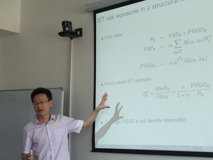 本次研讨会由长江商学院助理教授宋忠智就“投资冲击对横截面回报率的影响” 做了专业而精彩的报告。宋忠智教授提出了一个新的基于投资数据衡量技术冲击(IST)的方法, 这不同于以往的基于变量指标的测量方法。此外,文章用这个新的测量方法研究了IST对股票回报率的影响,并将其应用到账面市值比(B/M),发现价值型的公司比成长型的公司有更高的IST。最后,文章从实验数据方面和从结构模型两个方面,对基于投资和基于变量指标的IST对账面市值比的影响做了比较。在实验证据中发现,基于投资的IST衡量的价值型公司有较高的beta,但是基于变量指标衡量的价值型公司有较低的贝塔。在结构模型中发现,基于投资的IST与基于变量指标的IST是等价的。在报告会中,参会老师与演讲嘉宾就报告内容展开了热烈的讨论,使得参会人员受益匪浅。