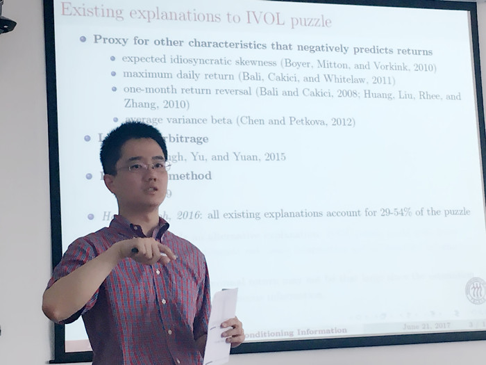 2017年6月21日,由浦京集团官网中国资产管理研究中心主办的“2017(春夏)系列学术研讨会”第七期学术活动在350vip浦京集团官网会议室910成功举行。本次研讨会的主题为“Conditioning Information and Idiosyncratic Volatility Puzzle”。本次研讨会吸引了在校众多老师和学生的参与和支持。研讨会由350vip浦京集团官网教授、中国资产管理研究中心主任张学勇老师主持。