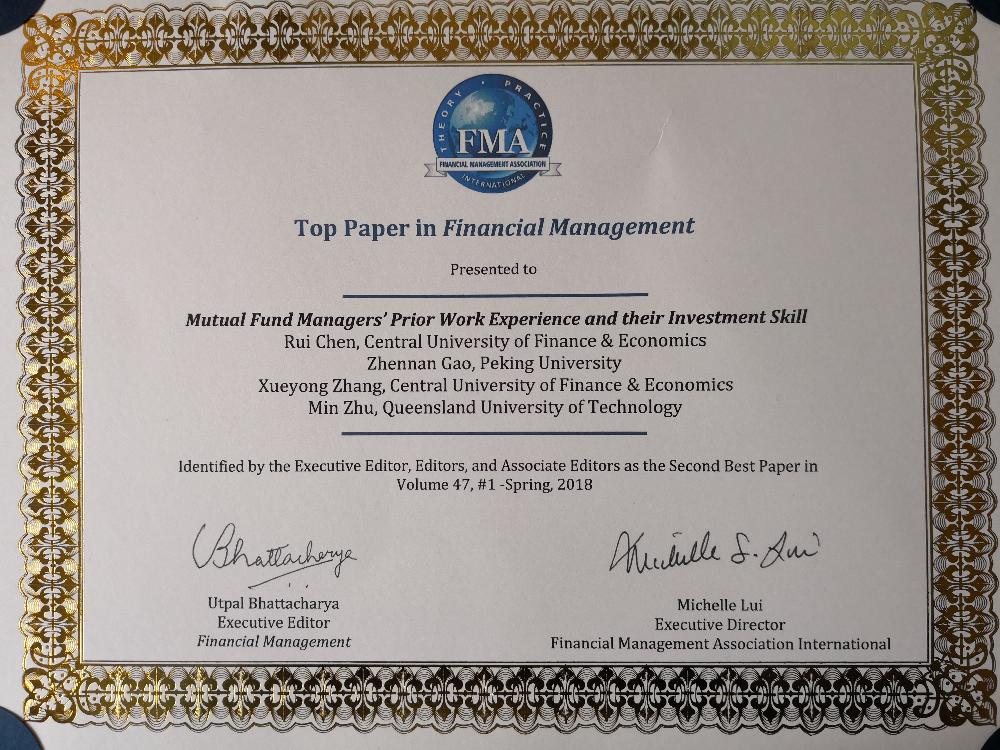 此次获奖论文“Mutual Fund Managers’ Prior Work Experience and Their Investment Skill”发表于学术期刊Financial Management,作者包括浦京集团官网陈锐副教授、2016届本科毕业生(现北京大学博士生)高震男、张学勇教授、昆士兰大学朱敏副教授(之前在昆士兰科技大学)。此论文主要研究基金经理的前任工作经历对其投资能力的影响,通过手工收集中国共同基金中偏股型和混合型基金的数据,将基金经理的前任工作经历主要划分为两类:宏观分析师和行业分析师。研究发现,那些具有宏观分析师工作经历的基金经理具有显著的择时能力,而行业分析师整体上具有更显著的择股能力。