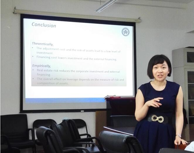 讲座中,邓筱莹博士从公司持有房地产投资的动机谈起,构建了一个一般模型来描述公司投资决策中风险、调整成本和现有资产折价间的关系。从模型可推断出风险和现有资产的调整成本会使得公司投融资行为双双下降。接着邓博士介绍实证数据的构成为1985年至2013年美国公司在房地产上的风险暴露,该数据将杠杆率过高的房地产投资信托剔除在外。该实证研究证实了公司长期投资和长期外部融资是与房地产市场风险负相关的。邓博士强调,金融危机时期房地产市场自身的系统风险为检验公司投资与房地产市场风险是否存在内生性问题提供了绝佳的样本。