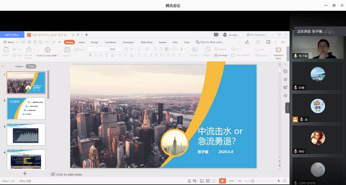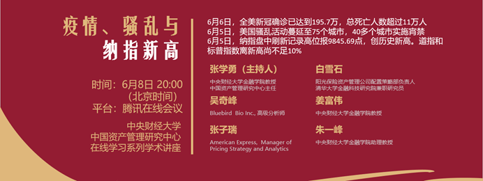 2020年6月8日晚八点,由350vip浦京集团官网资产管理研究中心举办的在线学习讲座活动在“腾讯会议”平台成功举办。本次讲座的主题是“疫情、骚乱与纳指新高”,由350vip浦京集团官网研究生院院长、350vip浦京集团官网教授、中国资产管理研究中心主任张学勇老师主持。此次会议时长1小时45分钟,共有44人到会,主讲嘉宾共6位。讲座初始,张学勇老师就近日美国新冠病毒、美国骚乱活动及6月5日纳指刷新高位进行总体概述,引出本次讲座的主题。