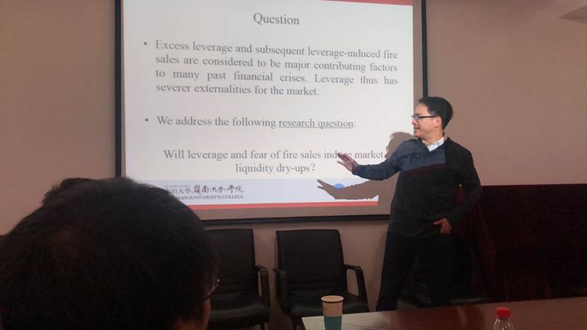 Jeremy Goh教授以“Do’sand Don’ts in the Publication Process”为主题进行了分享。他以具体的研究方法、实践研究为切入点,提出了能否发表的三个关键点:研究问题是否有趣,能否讲述一个有吸引力的故事;研究是否具有强有力的理论背景;研究是否具有投资和政策方面的含义。最后,Jeremy Goh教授结合自己最近的一篇研究成果,详细介绍了从写作动机、研究构思、论文写作、期刊投稿一系列过程中需要注意的地方。最后,曹夏平做了题为“Market Liquidity Effect of Leverage Prior to Fire Sales”的专题报告。曹夏平教授的演讲深入浅出,结合案例使复杂的问题变得简单易懂,获得在座师生的阵阵掌声。