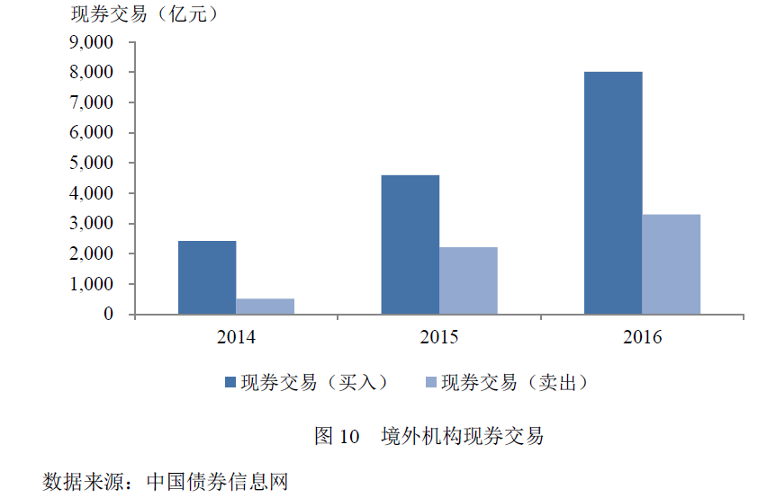 中国债券市场开放仍然具有巨大的发展空间。虽然境外机构持债规模不断增长,但是在市场中的占比仍然偏低。截至2016年底,境外机构债券托管量占比仅为2.52%,即使是境外机构持债规模最大的国债,占比也仅为3.93%。截至2011年,全球范围内比较各国债券市场的对外开放程度,除中国外17个统计国家中债券市场开放度平均为16%,其中包括德国、英国、美国、日本在内的发达国家债券市场开放度平均为26%13个新兴市场国家和地区债券市场开放度平均为13%。中国债券市场开放度远远落后于发达国家,甚至一些发展中国家和地区(见图8)。在持债结构上,境外机构偏好持有国债和政策性金融债,而信用债的持有量较少(见图9)。这一方面反映出境外机构在跨境投资方面对风险控制较为严格,尤其是早期进入银行间债券市场的境外投资者,由于机构类型或业务类型的限制,对风险非常谨慎,评级授信较为严格;另一方面反映出境内信用评级国际认可度不高,对于同一境内发行主体,境内外信用评级机构给予的评级不同,境外机构只能选择投资主权评级产品。在交易情况上,境外机构交易并不活跃,现券交易总体买入大于卖出,表现出较强的持有到期倾向(见图10)。中国债券市场开放仍然任重而道远。