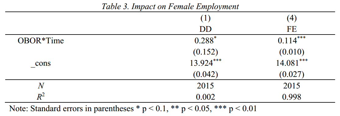 从表2和表3可以看出,“一带一路”倡议可以提高沿线国家的男女就业水平,其中对男性和女性的就业增长率的影响系数分别为0.138%和0.114%,说明对男性的影响更大。
