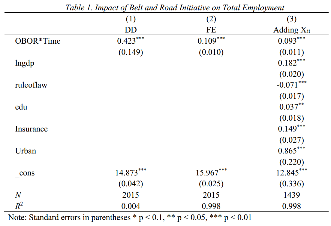 据国际劳工组织(ILO)数据显示,2013-2016年间“一带一路”沿线国家的平均就业增长率在0.43%左右,这一增长的影响因素可能是多方面的,本文试图将其中“一带一路”倡议的贡献分离出来,并分析其对劳动力市场的结构性影响。本文的贡献在于:第一,我们不是假设分布函数和预测数据的有效性,而是根据国际劳工组织提供2004 - 2016年的实际就业数据进行分析。第二,我们采用DID估计法,将2013年 “一带一路”倡议实施前后的沿线国家(实验组)与非沿线国家(对照组)的就业率进行对比。第三,本文的重点不仅仅局限于就业率,还关注“一带一路”倡议对沿线国家内部就业结构的影响。根据国际劳工组织的就业分类,我们分别讨论了不同性别和教育水平的“一带一路”倡议的异质效应。
