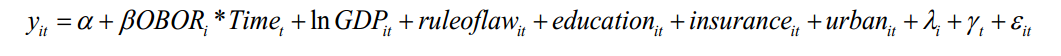 i和t分别代表国家和时间, yit为第t年i国的就业特征度量指标, OBORi为虚拟变量,是“一带一路”沿线国家取值为1,否则为0;time为时间的虚拟变量, 2013年以后取值为1,否则为0; lamdai为国家固定效应,控制各国的所有不随时间变化的因素; rt为年度固定效应,控制了各国共同的年度冲击。