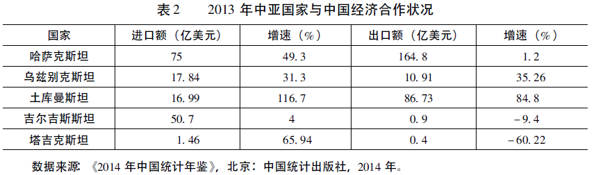 自上海合作组织成立以来,中国与中亚国家之间经贸关系日益紧密,双边贸易所占份额逐年提升。1992年中国与中亚五国双方贸易总额仅为4.46亿美元,到了2013年双方贸易总额达到了 502.8亿美元,新疆对中亚五国进出口190多亿美元,同比增长8%,占同期新疆外贸总值的七成。其中,出口130.1亿美元,同比增长4.2%;进口45.7亿美元,同比增长1.7%。边境小额贸易进出口贸易额127亿美元,同比增长1.9%,增幅回落26个百分点,占同期新疆对中亚五国贸易总额的 72.2%。五国中,对哈萨克斯坦进出口111.7亿美元,同比增长5.4%,占2012年新疆外贸进出口总值的44.4%;吉尔吉斯斯坦进出口40.4亿美元,增长6.1%;塔吉克斯坦进出口14.1亿美元,同比下降18.3%;乌兹别克斯坦进出口8.3亿美元,同比增长12.1%;土库曼斯坦进出口1.4亿美元,同比增长17.3%。近两年,中亚国家经济进入稳步发展时期,中国与中亚国家之间经贸合作拥有巨大的发展潜力。