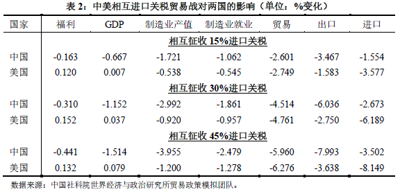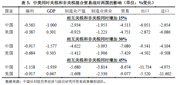 具体以中美同时设置30%关税和非关税混合贸易战的情形为例,中国的福利将下降0.917%,GDP减少1.577%,制造业产值和就业分别下降4.622%和3.093%,出口和进口贸易分别减少9.541%和4.104%。美国的福利将减少0.684%,制造业产值和就业分别下降1.412%和1.906%,而出口和进口贸易将分别减少4.502%和9.508%,仅有GDP增加0.503%。