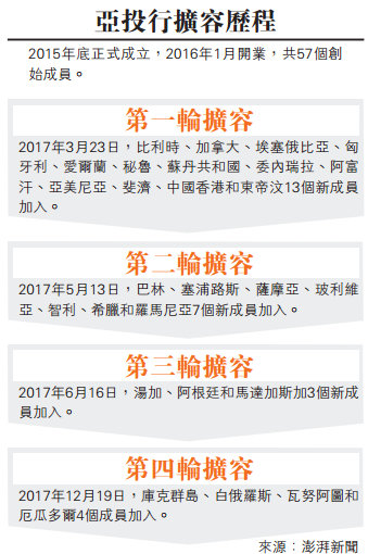 2. 2017年12月19日,亚洲基础设施投资银行(AIIB)对外宣布,已经批准通过库克群岛、白俄罗斯、瓦努阿图和厄瓜多尔四个成员国加入亚投行,这将亚投行的总数扩充至84个。这样一个千亿级的投行,从最初的57个创始成员国,经过四轮的扩容,达到如今的84个。亚投行行长金立群对新加入的四个成员国表示了热烈欢迎,并称“我们成员国的稳步扩充,代表了国际社会对亚投行的信任。”