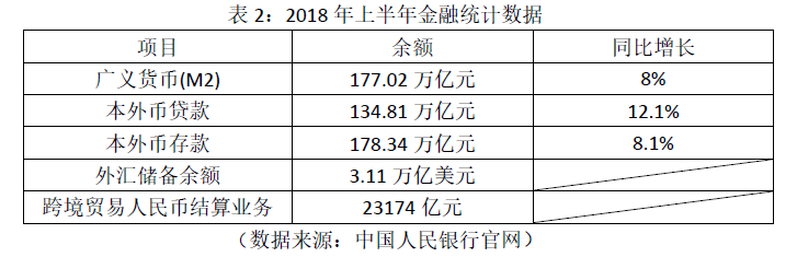 2. 2018年7月13日,中国人民银行发布了2018年上半年的金融统计数据,具体如表2所示。