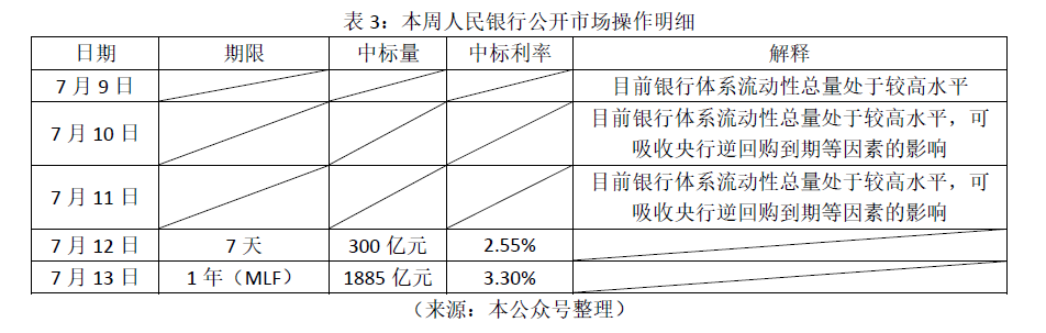 3. 2018年7月9日到7月13日,人民银行进行了多笔公开市场业务操作,具体表3所示。