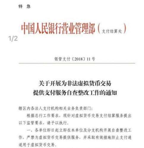 1. 2018年1月17日,央行营业管理部发布《关于开展为非法虚拟货币交易提供支付服务自查整改工作的通知》(下称《通知》),要求辖内各法人支付机构自文件发布之日起在本单位及分支机构开展自查整改工作,严禁为虚拟货币交易提供服务,并采取有效措施防止支付通道用于虚拟货币交易。各单位应于1月20日将自查情况、已采取措施等上报营业管理部。