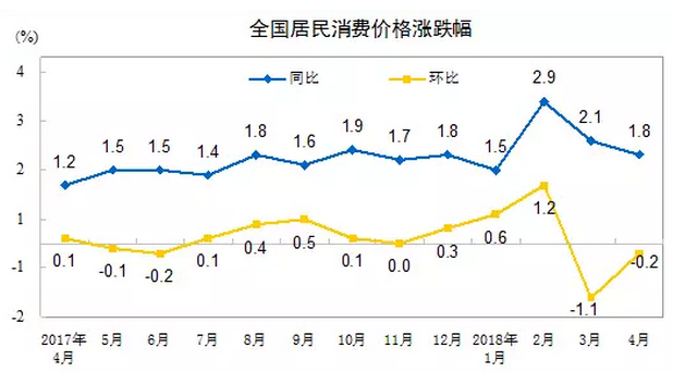 3. 2018年4月份,全国居民消费价格同比上涨1.8%。其中,城市上涨1.8%,农村上涨1.7%;食品价格上涨0.7%,非食品价格上涨2.1%;消费品价格上涨1.3%,服务价格上涨2.6%。1-4月平均,全国居民消费价格总水平比去年同期上涨2.1%。