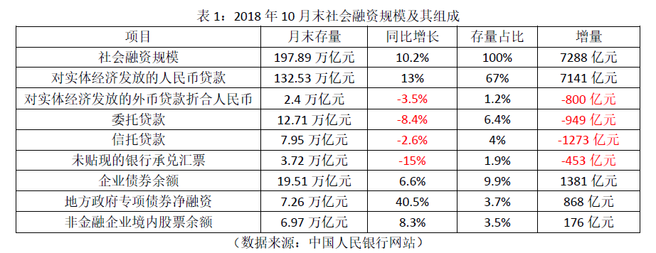 表1:2018年10月末社会融资规模及其组成