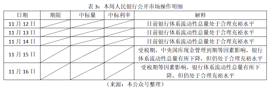 3.2018年11月12日到11月16日,人民银行未进行公开市场业务操作,具体表1所示。