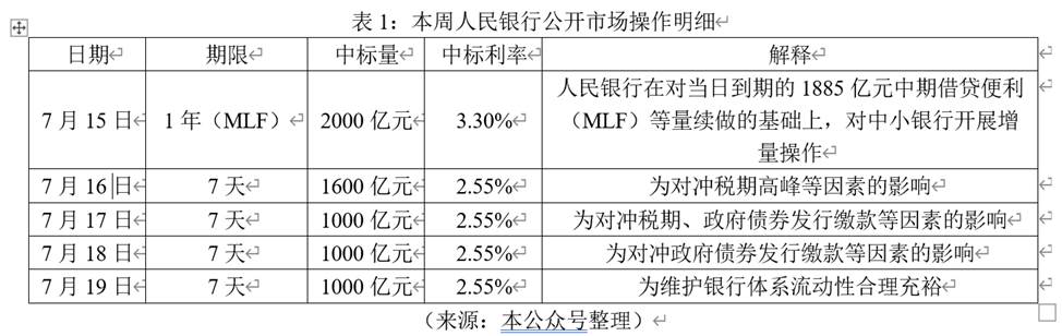 编者按:本周人民银行在对当日到期的1885亿元中期借贷便利(MLF)等量续做的基础上,对中小银行开展增量操作,总操作量2000亿元。这次MLF操作是从2019年5月15日开始,人民银行对服务县域的农村商业银行实行较低存款准备金率,分三次实施到位。本周为实施该政策的第三次存款准备金率调整,释放长期资金约1000亿元。