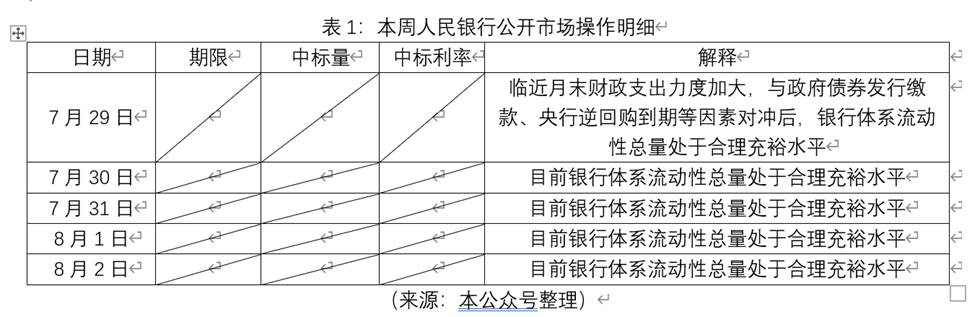 3.2019年7月29日到8月3日,人民银行未进行公开市场业务操作,具体表1所示。