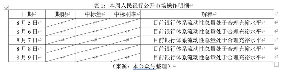 2.2019年8月5日到8月9日,人民银行未进行公开市场业务操作,具体表1所示。