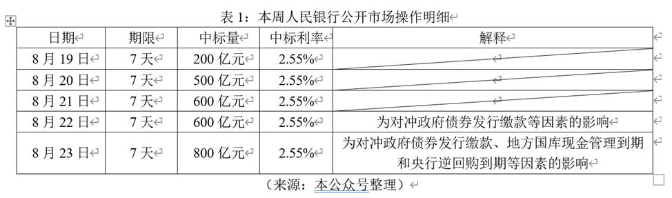 2.2019年8月19日到8月23日,人民银行进行了多笔公开市场业务操作,具体表1所示。
