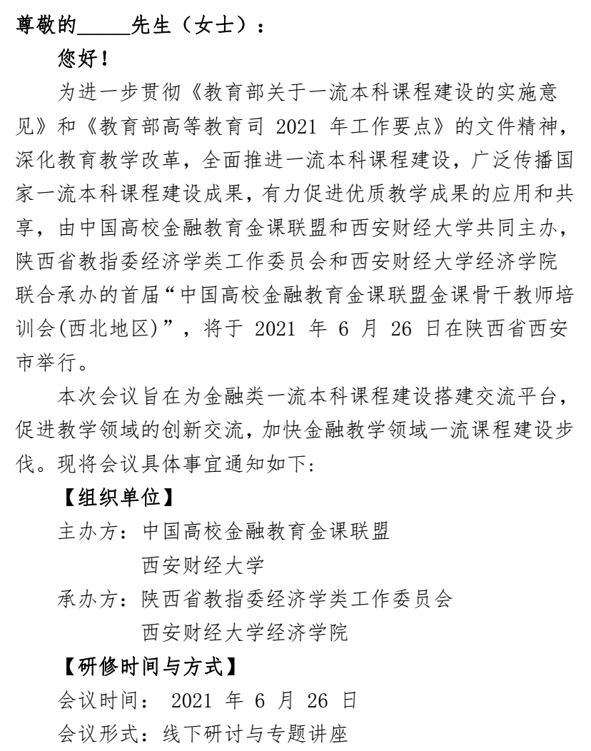 首届中国高校金融教育金课联盟金课骨干教师培训会(西北地区)邀请函