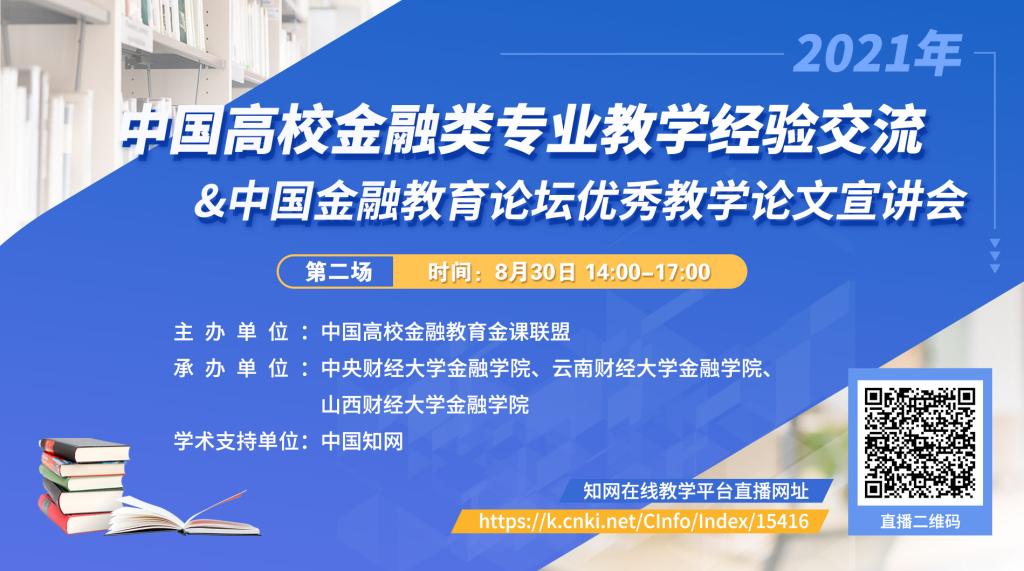 为贯彻《教育部关于加快建设高水平本科教育 全面提高人才培养能力的意见》(教高[2018]2号)和《教育部高等教育司2021年工作要点》的文件精神,深入推进优质教学成果的应用和共享,不断提高高校教师的教学研究水平,中国高校金融教育金课联盟经研究,计划于8月27日、8月30日和8月31日下午14:00~17:30举办“2021年中国高校金融类专业教学经验交流&中国金融教育论坛优秀教学论文宣讲会”公益活动,其中拟邀的主讲人为2020年和2021年中国高校金融教育论坛的优秀论文作者。本次活动为线上会议,由中国知网提供平台支持与技术服务。
