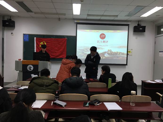 会议的第四项内容是民主测评,计监票员为王瀚晨同志,监票员是马若璨和王睿贤同志。在计票员清点与会党员数之后,发放测评表,对所有党员进行投票测评,最后监票员和计票员统计民主测评结果。