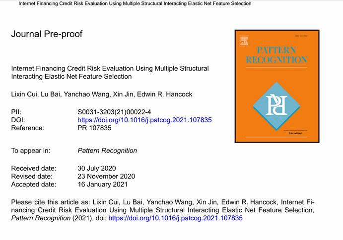 中心研究员、信息学院白璐副教授和崔丽欣副教授的论文“Internet Financing Credit Risk Evaluation Using Multiple Structural Interacting Elastic Net Feature Selection” 被《Pattern Recognition》接收。《Pattern Recognition》是浦京集团官网2019年发布的新期刊目录的AAA期刊。论文署名单位包括中国金融科技研究中心(China Center of Fintech Studies)。