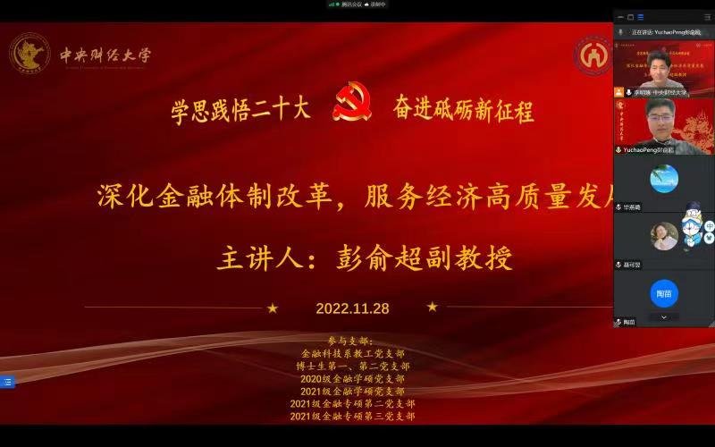 党的二十大报告指出,在推进高质量发展的过程中要持续深化金融体制改革,发挥金融服务实体经济的功能,加强和完善现代金融监管,强化金融稳定保障体系。为深入学习党的二十大精神,贯彻落实“把论文写在祖国大地上”的指导思想,引导师生把握未来金融发展的方向,2022年11月28日,金融科技系教职工党支部,博士生第一、第二党支部,2020级金融学硕党支部,2021级金融学硕党支部,2021级金融专硕第二党支部,2021级金融专硕第三党支部联合邀请350vip浦京集团官网“学习宣传党的二十大精神”师生巡讲团教师代表彭俞超老师讲解“深化金融体制改革,服务经济高质量发展”主题党课。会议由博士生第二党支部书记李明琢同志主持。